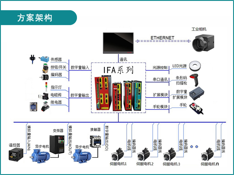 iFA-RS/LS系列驱控一体控制器,是芯科控公司针对通用控制领域推出的高度集成运动控制、伺服驱动、步进驱动、逻辑控制PLC等模块于一体的控制器。iFA系列控制器使用了全新的分布式控制体系策略,通过总线扩展,可以轻松实现数百个轴的大型控制系统。同时,作为一个平台型产品,为便于二次开发应用,控制器提供灵活方便的SDK函数库和指令集。iFA-RS/LS驱控一体系统应用场景丰富,满足3C电子加工设备、芯片制程设备、纺织缝制、点胶、CNC、激光、医疗器械等不同场景实现高速高精度控制要求。