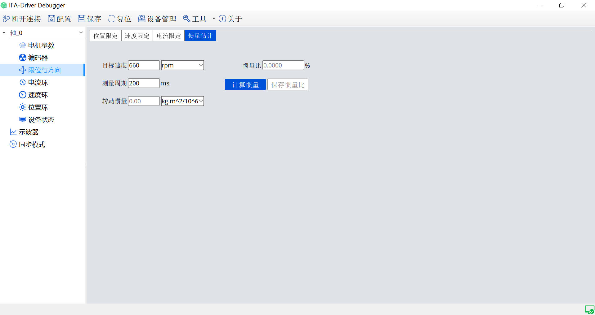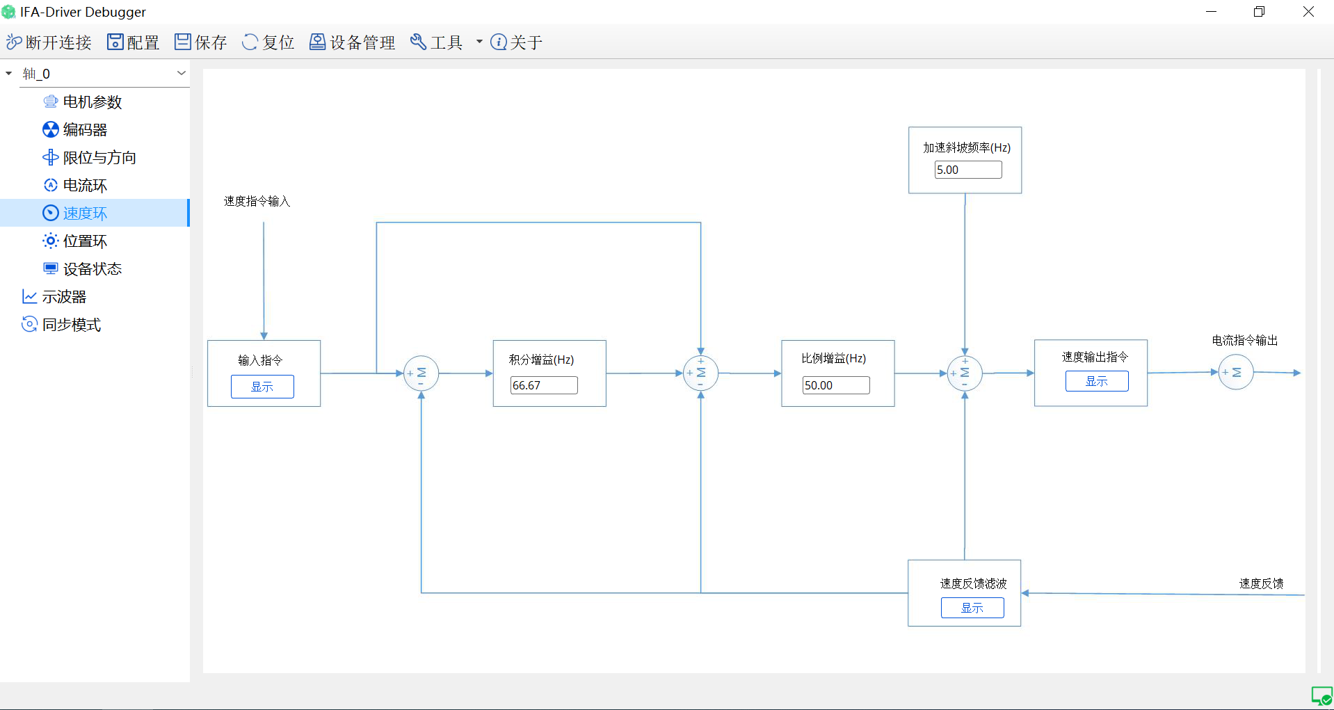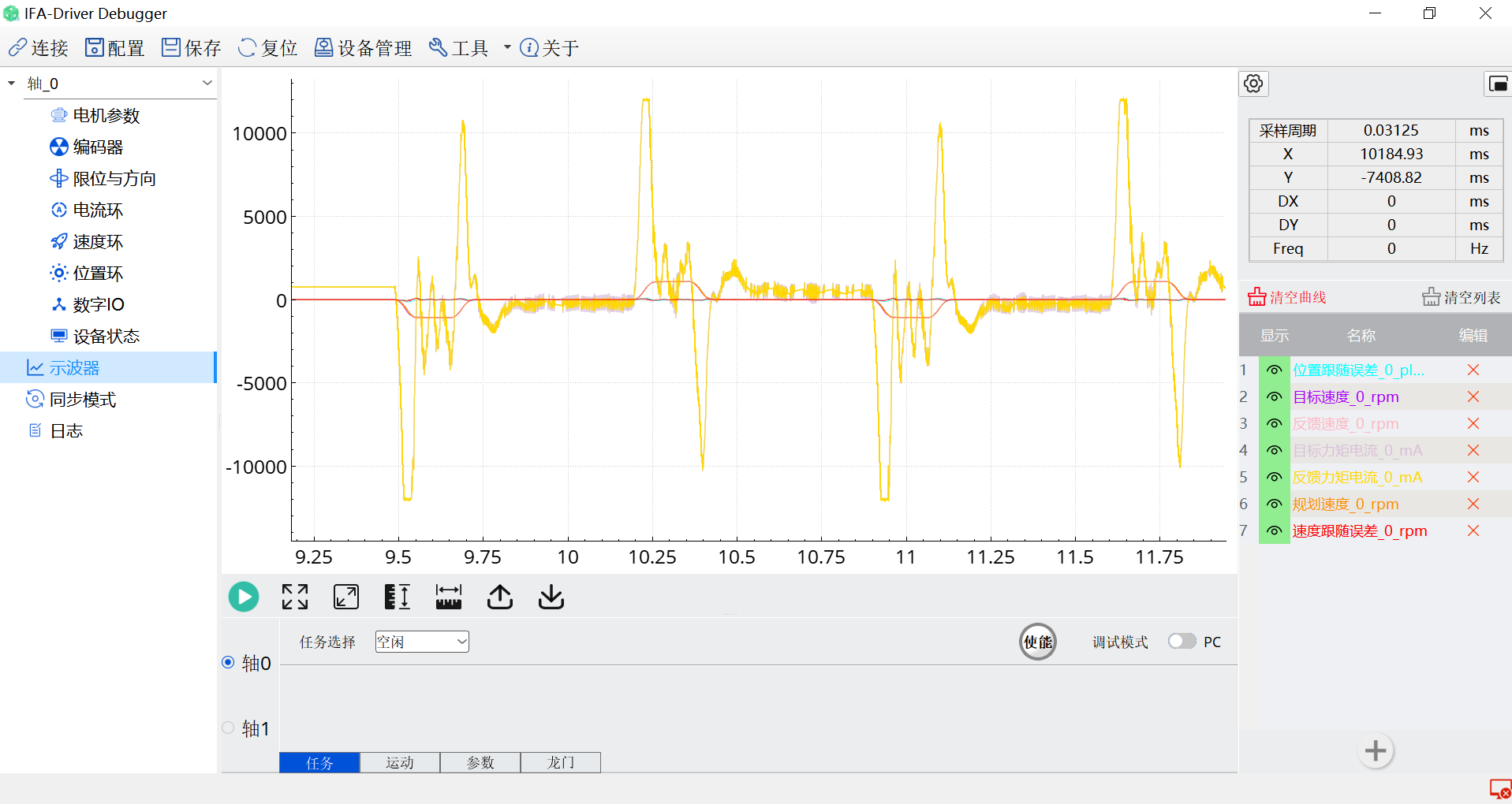 伺服驱动调试工具是针对伺服控制器进行配置、测试、监控的一款工具。它允许用户根据特定的电机和应用需求设置驱动器的配置参数,如电机、编码器参数以及相关的增益设置。另外用户可以动态地调整参数以优化伺服性能,如调整各个环路参数、增益后在示波器中对电流环、速度环、位置环、电压测试等观察对应的曲线。它还可以实时监测设备是否有警告信息如过流、过温、过压等。可以导出当前的设备配置,以便在需要时快速导入到其它相同规格的设备中。