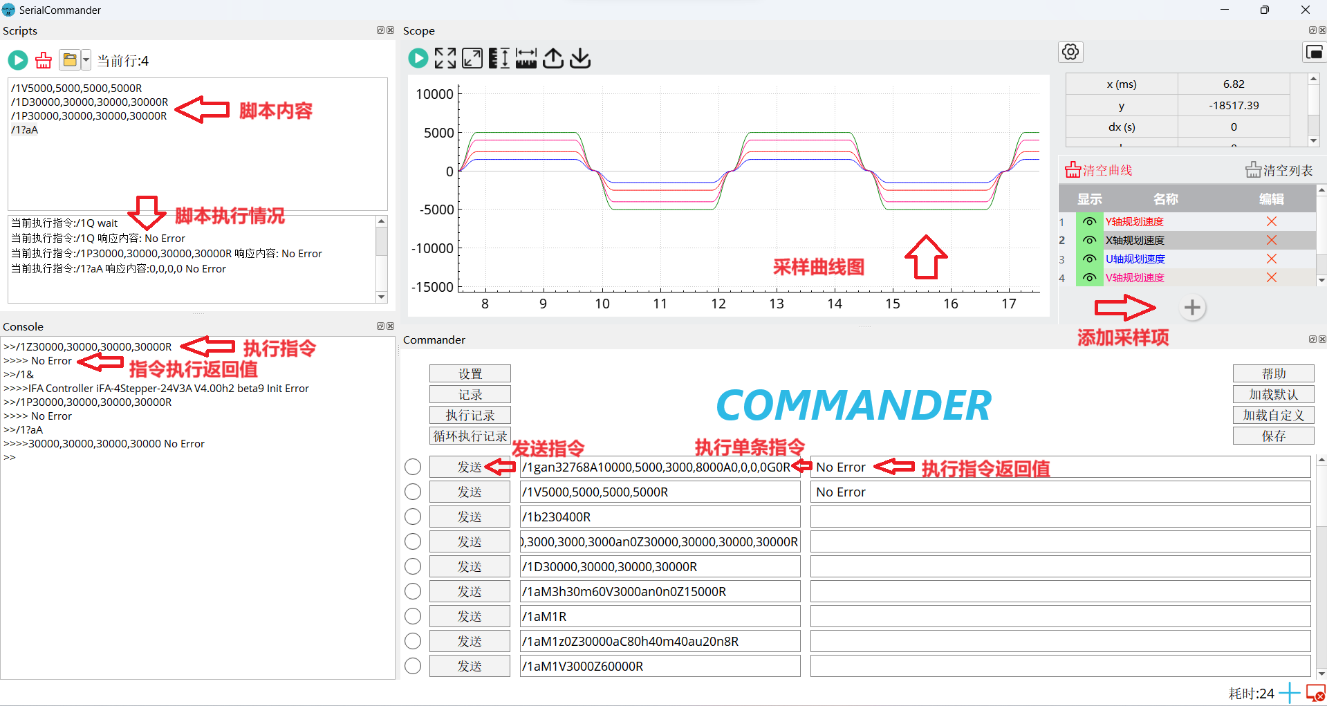 步进驱动调试工具是对步进控制器进行下发指令、监控的一款工具。它可通过向驱动器发送一系列简单的文本信息来控制iFA-4Stepper的运动。可在示波器通过选择采样项来实时观察各轴响应的速度、位置等信息。也可根据客户自身需要组合复杂的指令逻辑以实现多个轴的协同工作。支持通过串口或特定网络来更新底层固件信息。