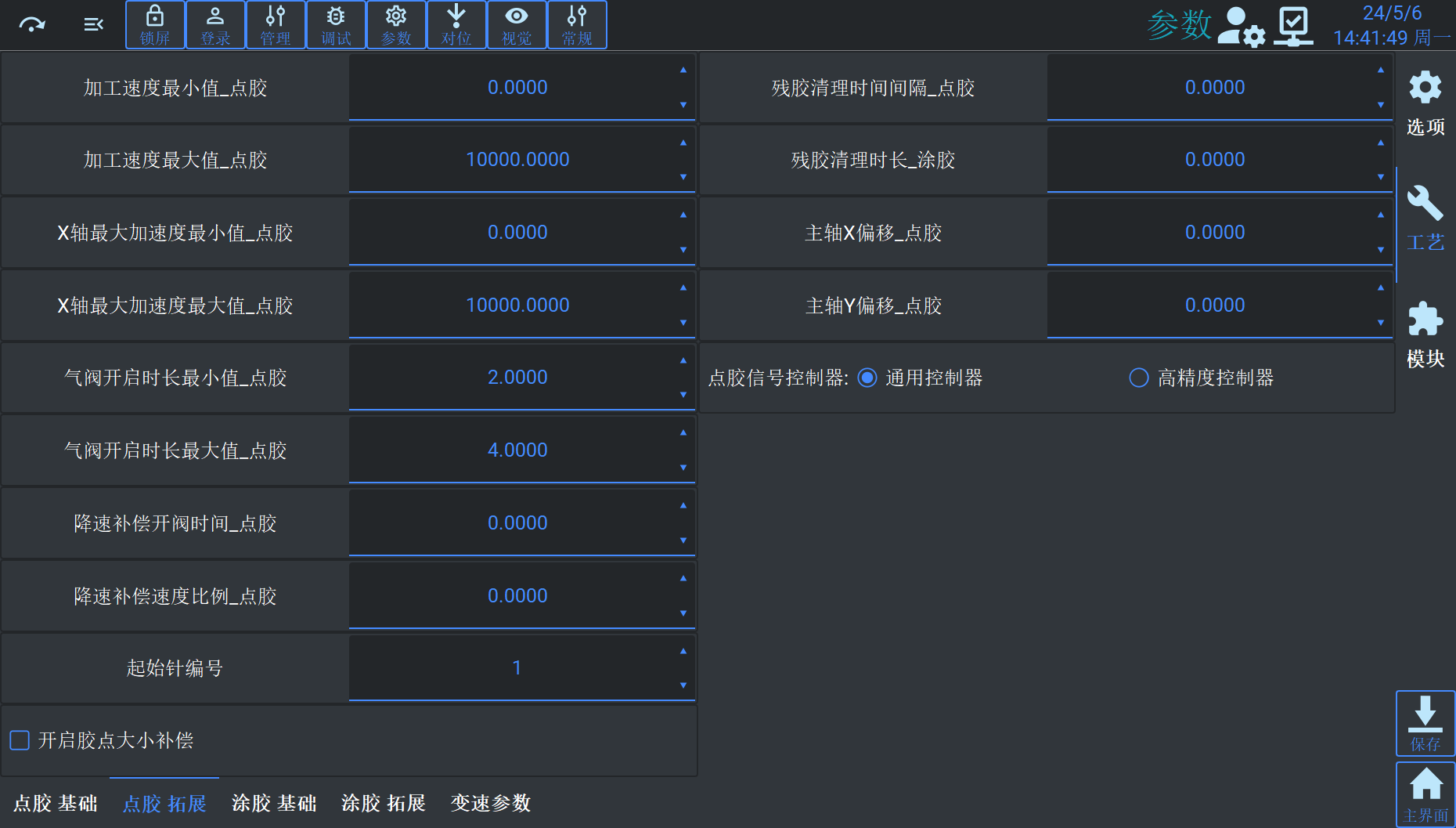 The visual dispensing process package is divided into general positioning, measurement, contour generation, and other functions, supporting mark positioning and panoramic vision, with different processing methods for rigid items and flexible deformable items.